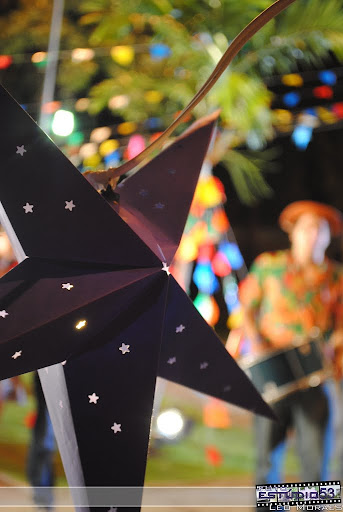 A intenção nessa fotografia era pegar o ar de festa junina. O foco na estrela e de fundo um zabumbeiro. A abertura foi f5.6, achei o ideal. pois o foco ficou bem definido na estrela e o zabumbeiro, mesmo desfocado mas se nota que é um zabumbeiro. Abertura f1.8 ele se tornaria apenas um borrão, que seria sem sentido algum.